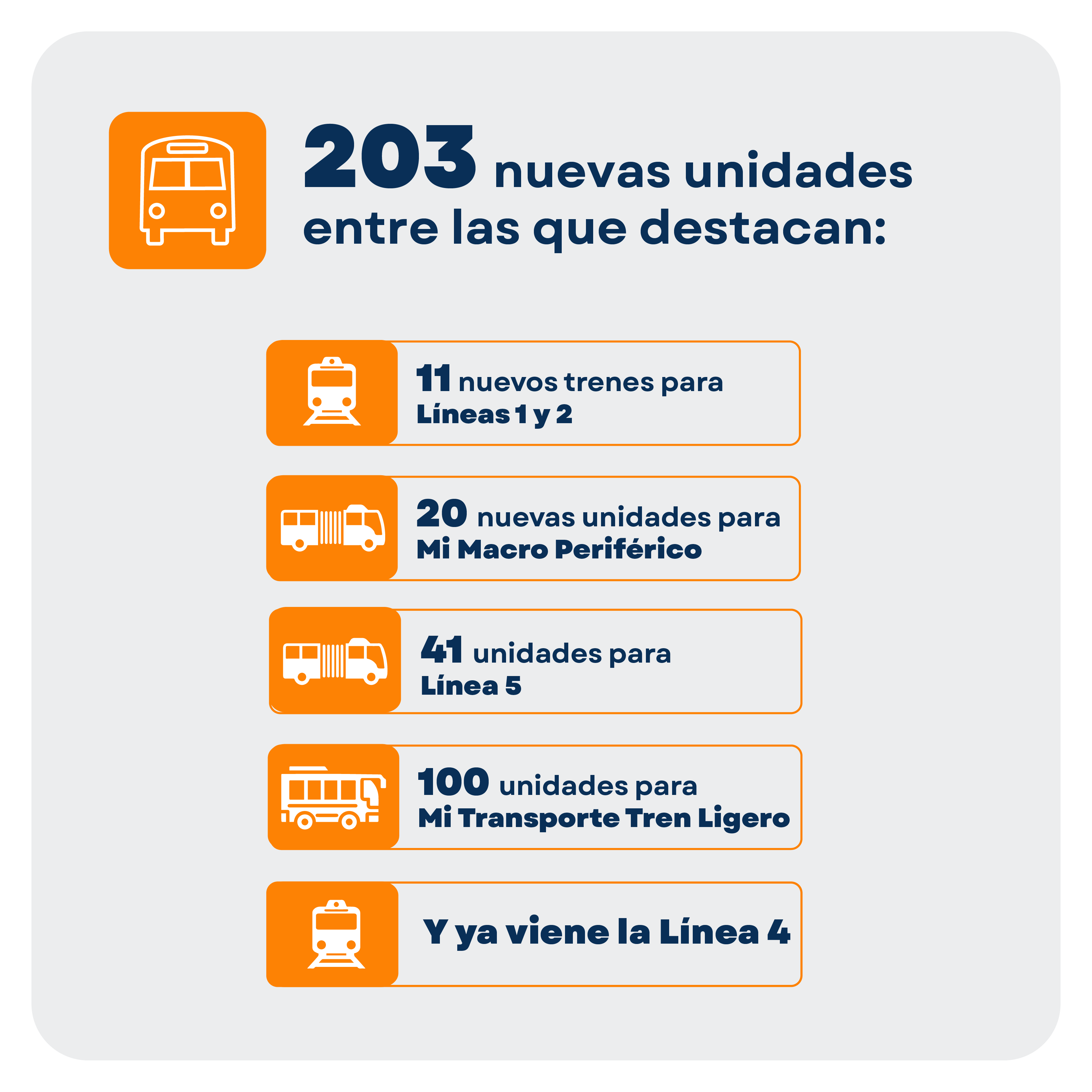 Una vez concluidas las entregas de 203 unidades, se tendrán 849 mil beneficiados diarios en las Líneas 1 y 2 de Mi Tren, Mi Macro Periférico, Línea 4 y 5 del transporte público, Mi Transporte Tren Ligero y Puerto Vallarta
